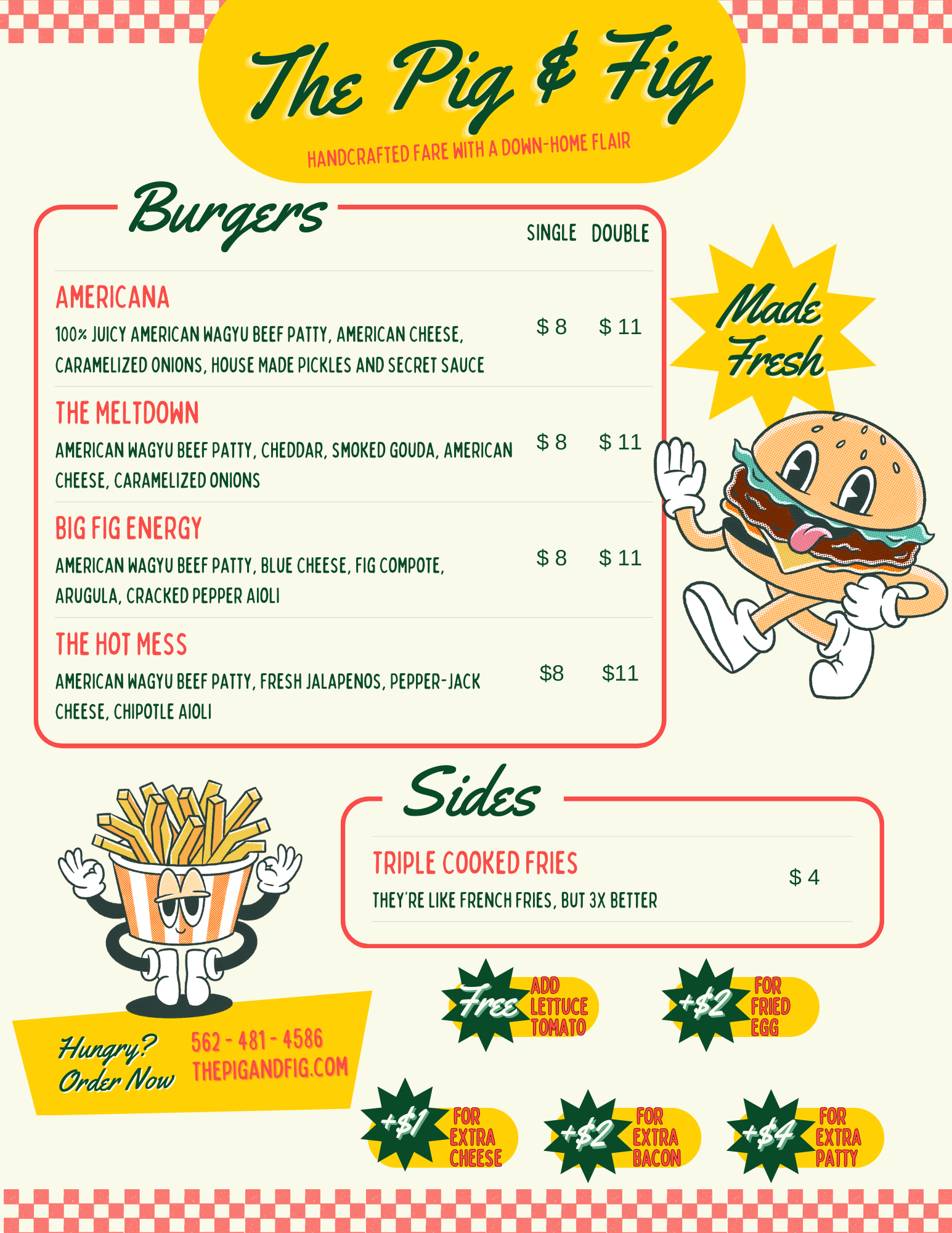 Welcome to the Pig and Fig where our burgers are a journey of flavor and fun. Join us in a world where flavor roams free.